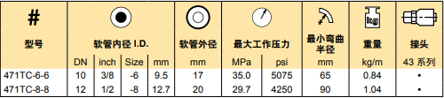 適用介質(zhì):石油基液壓油,水乙二醇,潤(rùn)滑油,空氣和水。用于1.7MPa以上的空氣時(shí),軟管需針刺。